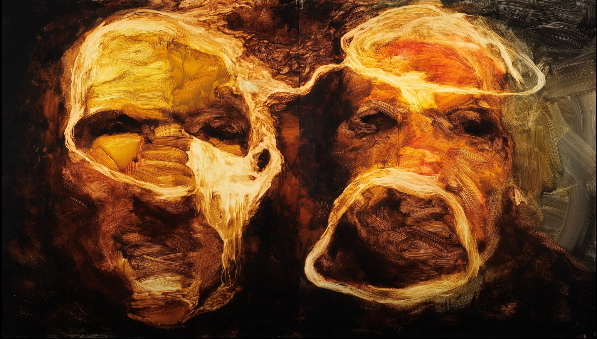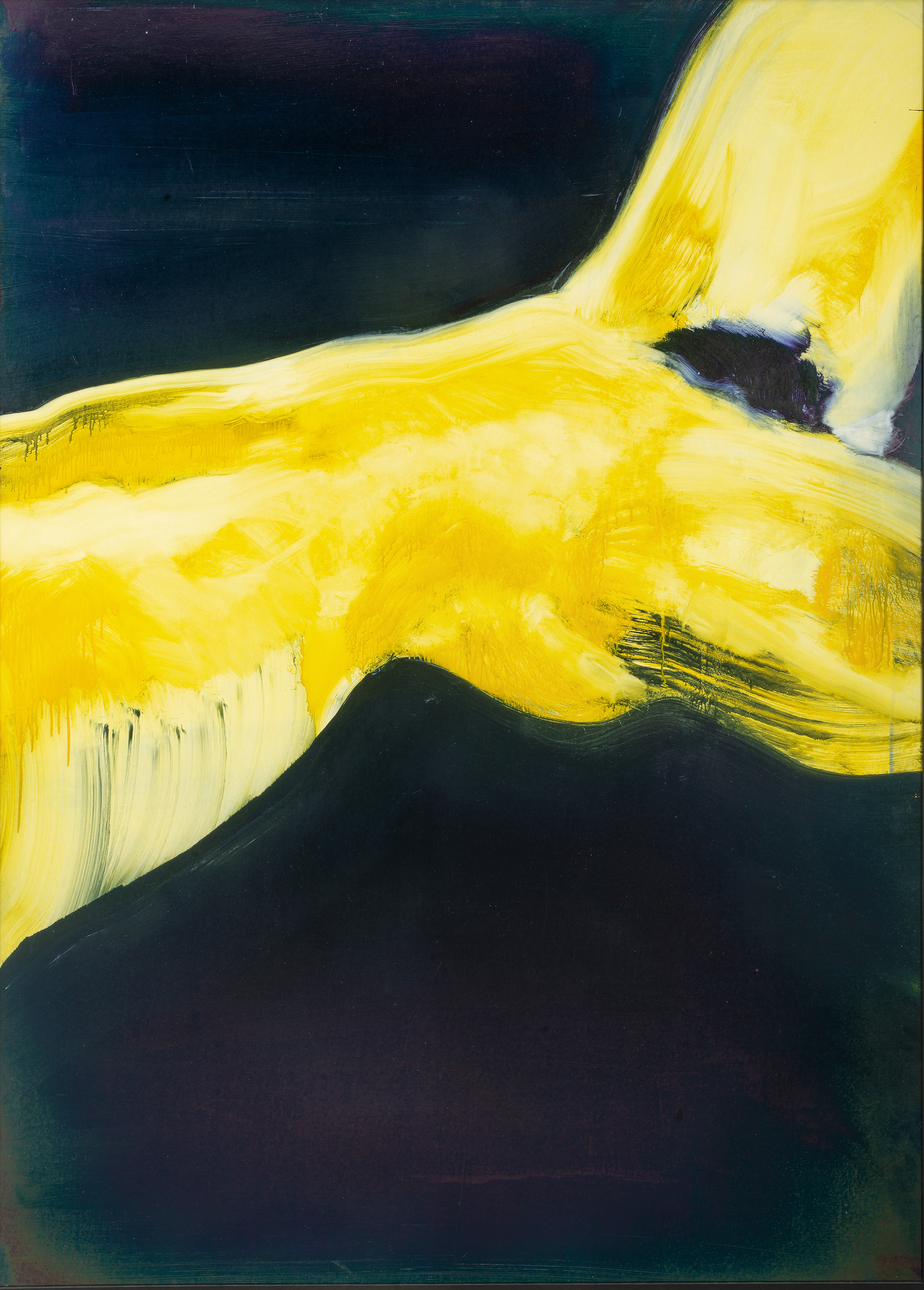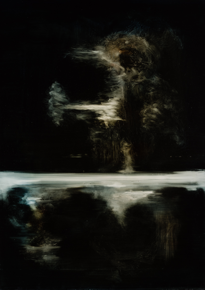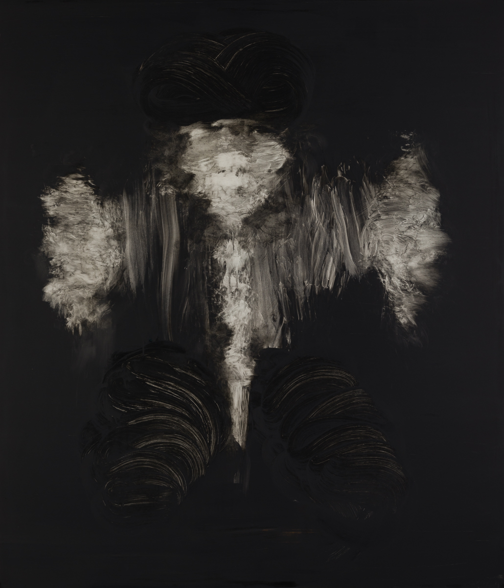 La superposition et l’effacement des très nombreuses couches lisses des encres diluées accentuent encore ce sentiment de présence indicible sur la toile.