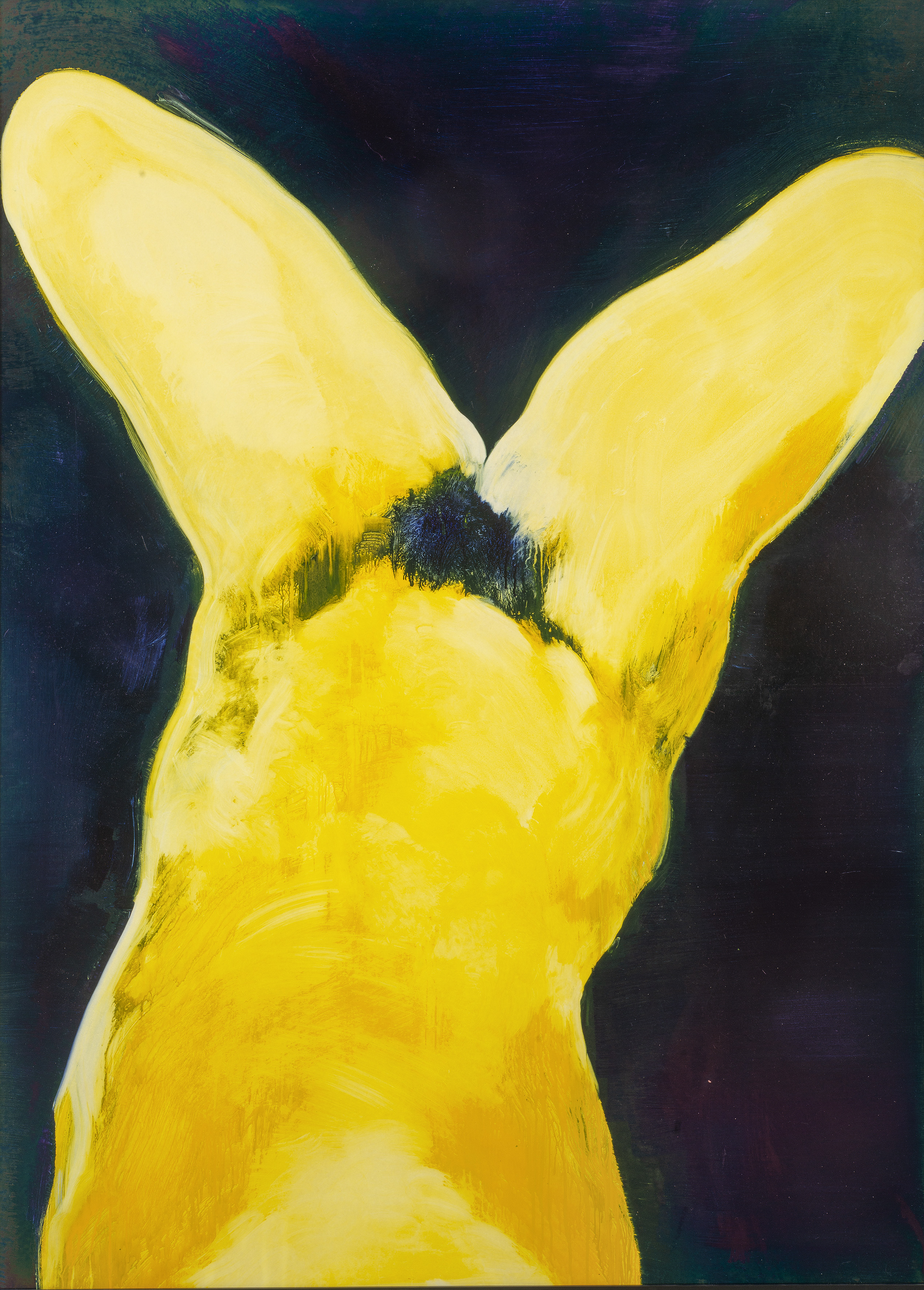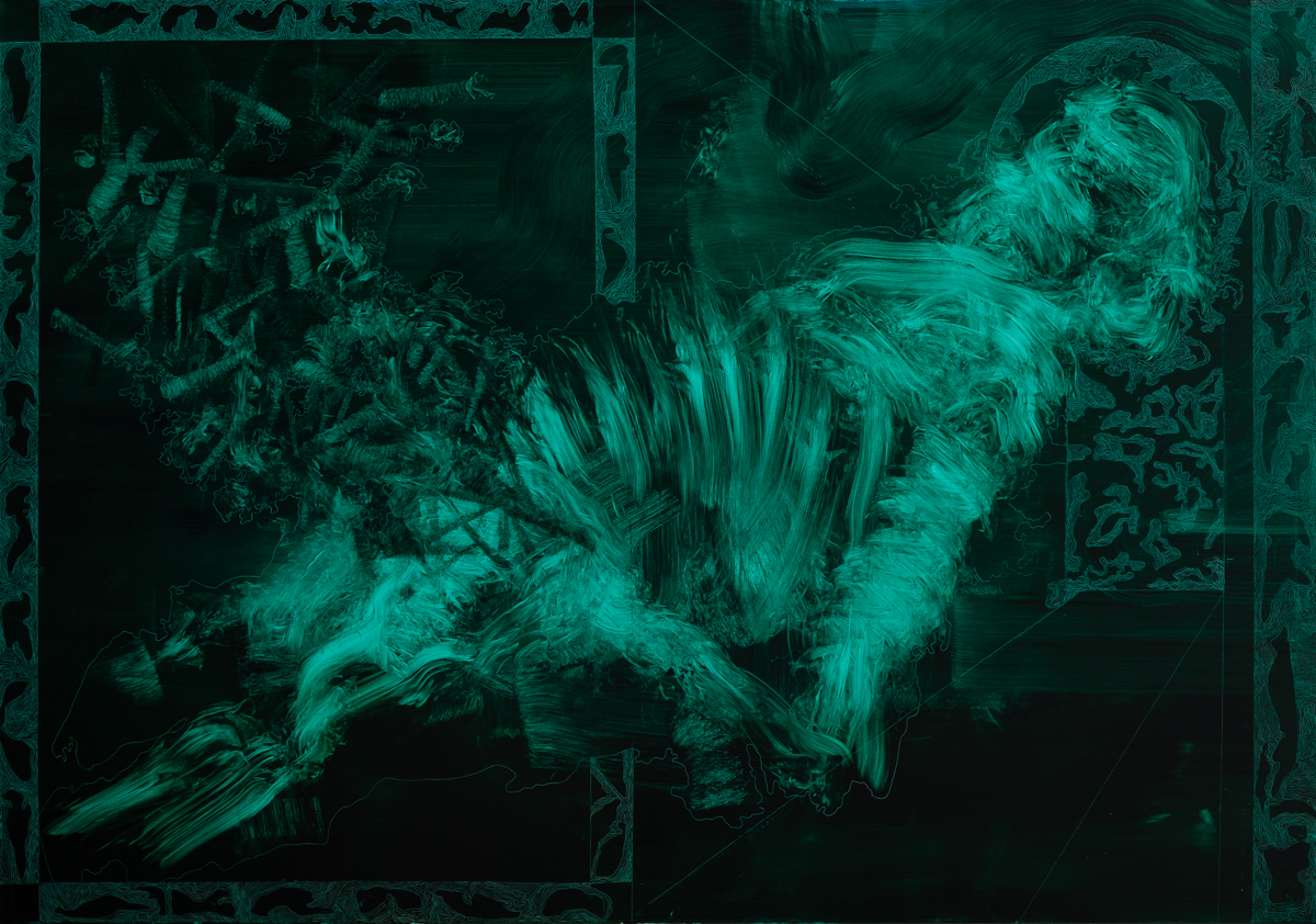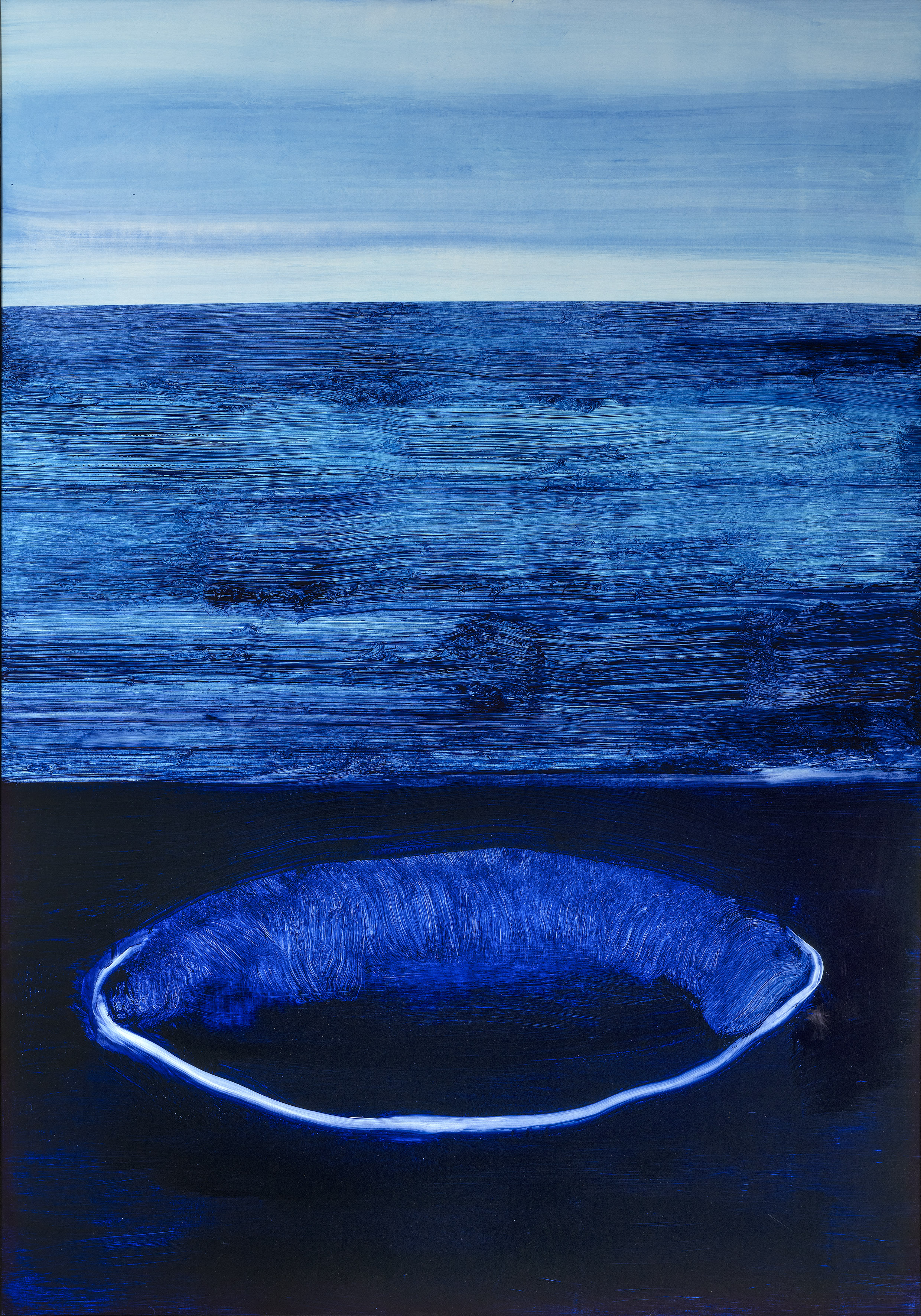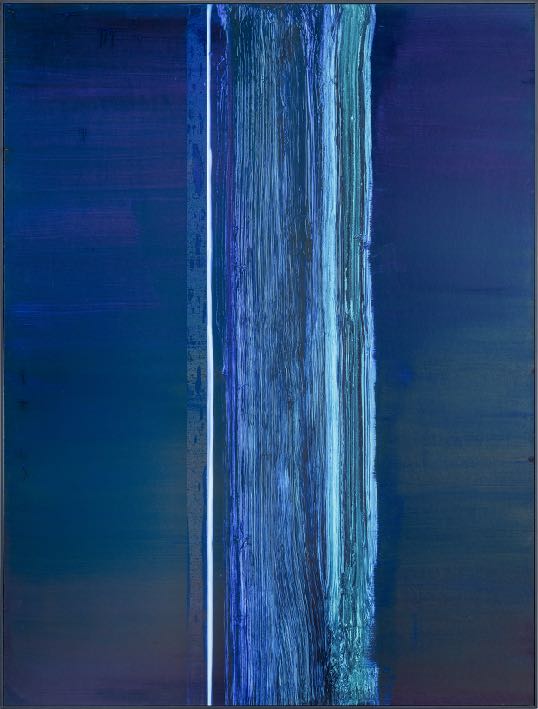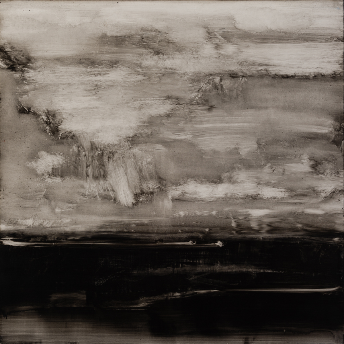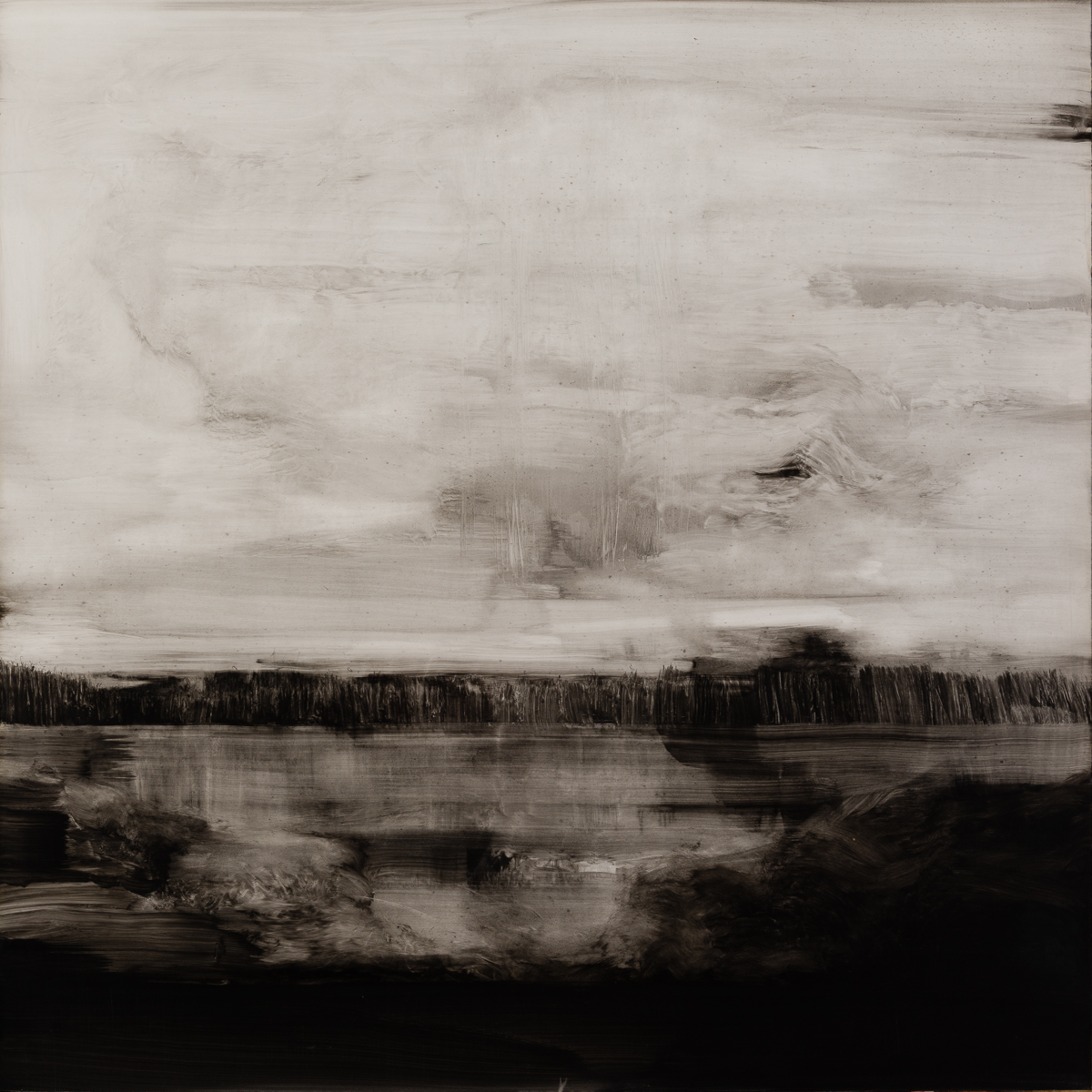 La superposition et l’effacement des très nombreuses couches lisses des encres diluées accentuent encore ce sentiment de présence indicible sur la toile.