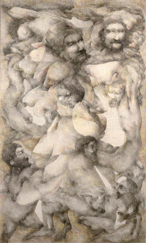Dessin à la mine de crayon noir et couleur sur papier marouflé sur toile de lin