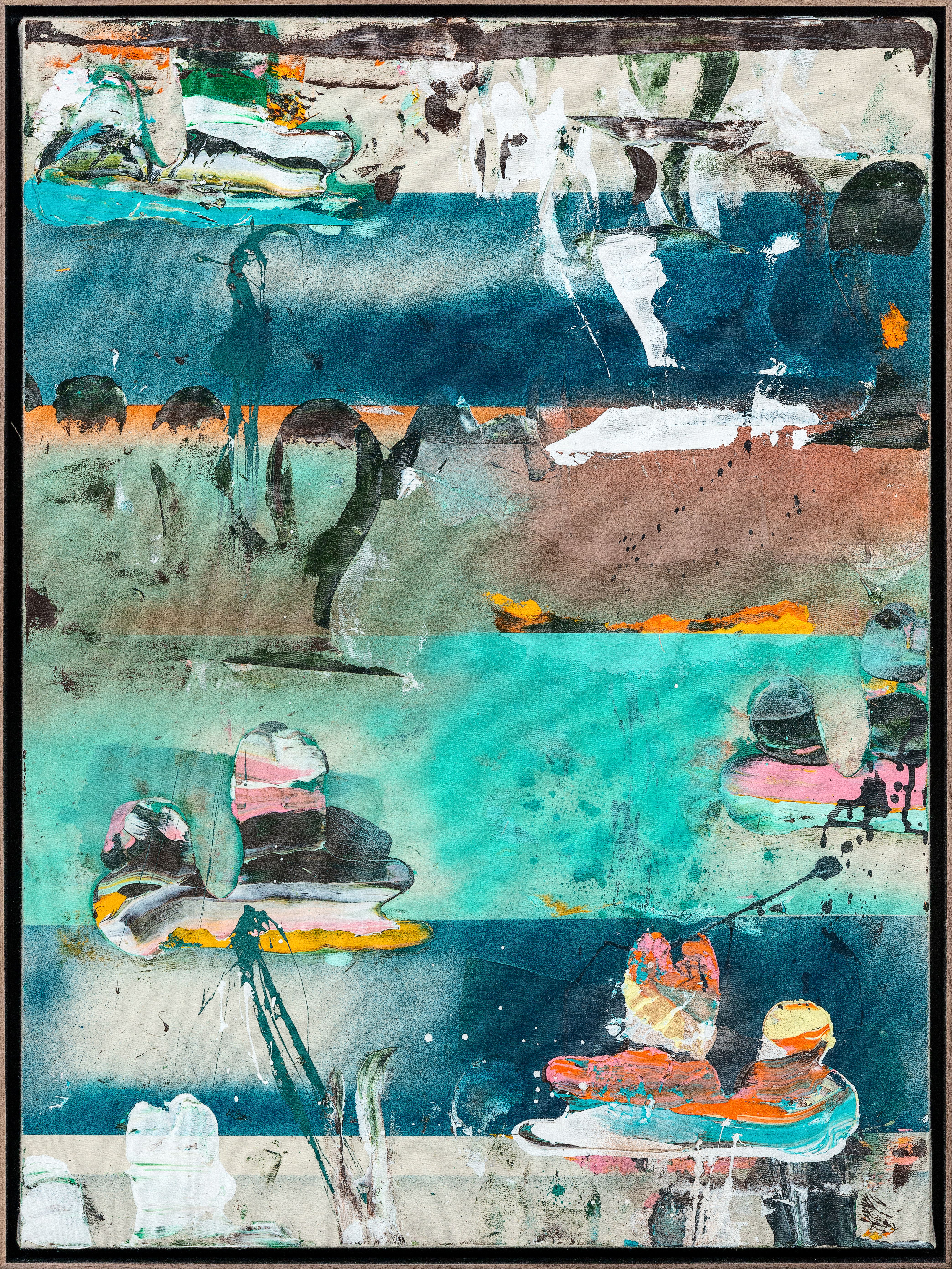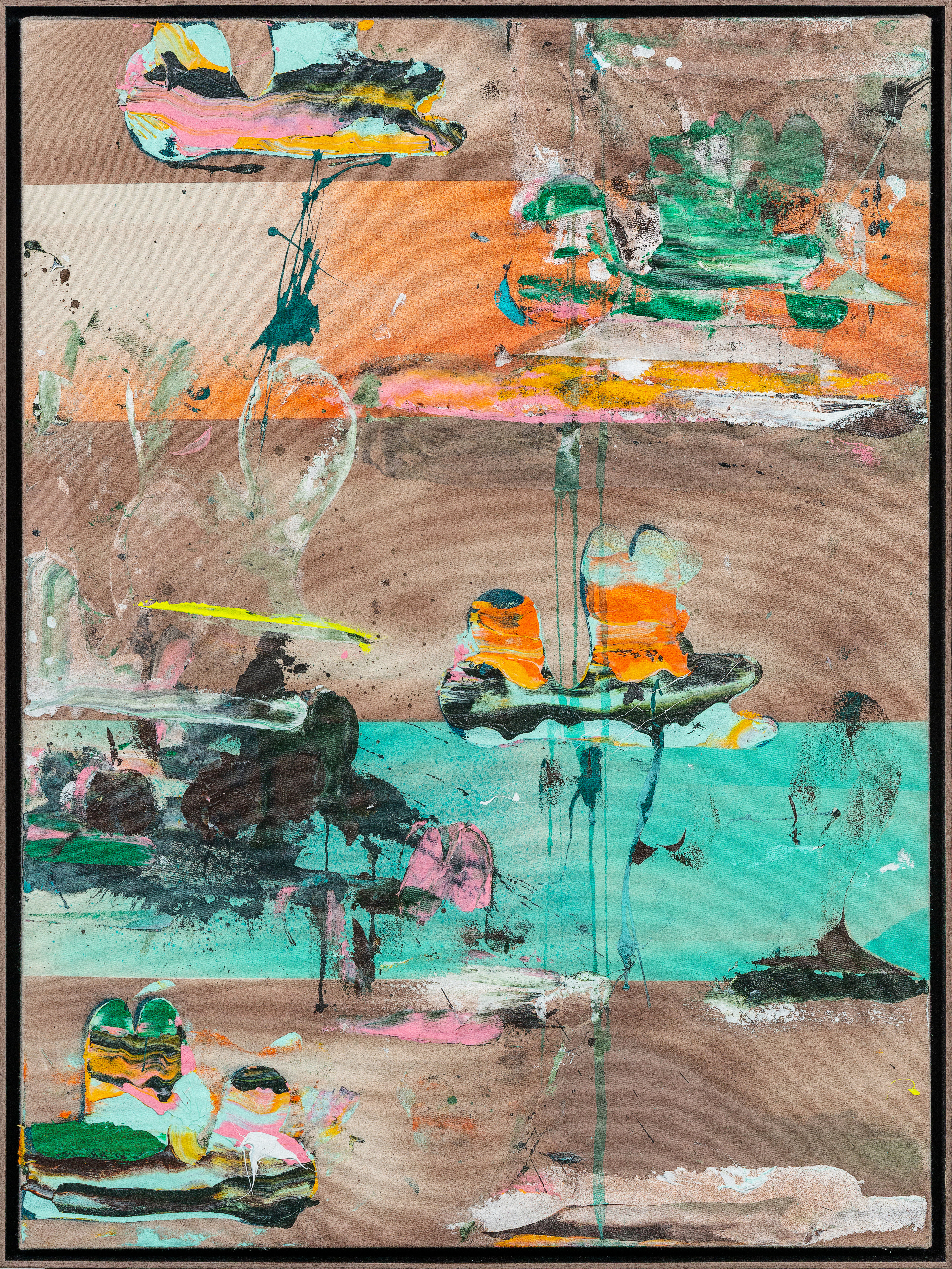 Libre d’expérimenter, Kevin Douillez aborde l’imaginaire abstrait sous la forme d’un purgatoire. Projetées, éclatées, incisées, les couches de peintures acryliques se répondent les unes aux autres afin de construire un — nouvel — équilibre dans le désordre.